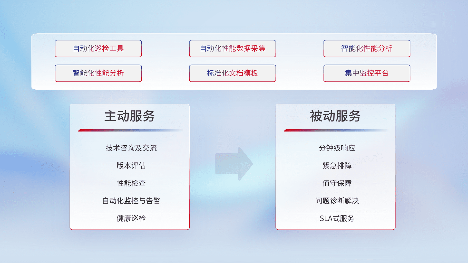 智能化工具和标准化文档,,,,保障服务质量,,,,提供主动服务(包含技术咨询、、、版本评估、、性能检查、、自动化监控与告警、、、健康巡检)和被动服务包含(分钟级响应、、、、紧急排障、、值守保障、、、、问题诊断解决、、SLA服务)。。。。